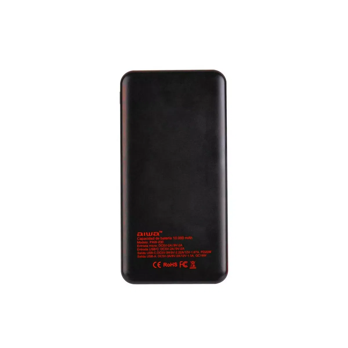 CARGA RÁPIDA MULTIDISPOSITIVO Con 10.000 mAh de capacidad y doble salida USB, el power bank Aiwa AW-PAW230 mantiene cargados tus dispositivos en todo momento. Ideal para smartphones, iPhone, tablets, audífonos y más. 4 EN 1 CON ACCESORIOS INCLUIDOS Este cargador portátil incluye cable USB para Android y cable para iPhone, lo que te permite conectar múltiples dispositivos sin necesidad de adaptadores adicionales. Sus indicadores LED permiten conocer el nivel de batería fácilmente. COMPACTO, FUNCIONAL Y SEGURO Su diseño liviano, delgado y con batería de polímeros de litio lo convierte en un accesorio confiable y práctico para llevar siempre contigo. Perfecto para viajes, jornadas laborales o emergencias. ESPECIFICACIONES TÉCNICAS Marca: Aiwa Modelo: AW-PAW230 Capacidad: 10000 mAh Batería: Polímero de litio Entrada: Micro USB 5V/2A Salida USB 1: 5V/1A Salida USB 2: 5V/2.1A Compatibilidad: Android, iPhone, iPod, audífonos, tablets Indicadores: LED de carga Incluye: Cable USB Android y cable USB iPhone Dimensiones: 13.8 x 7.3 x 1.4 cm Peso: 220 g