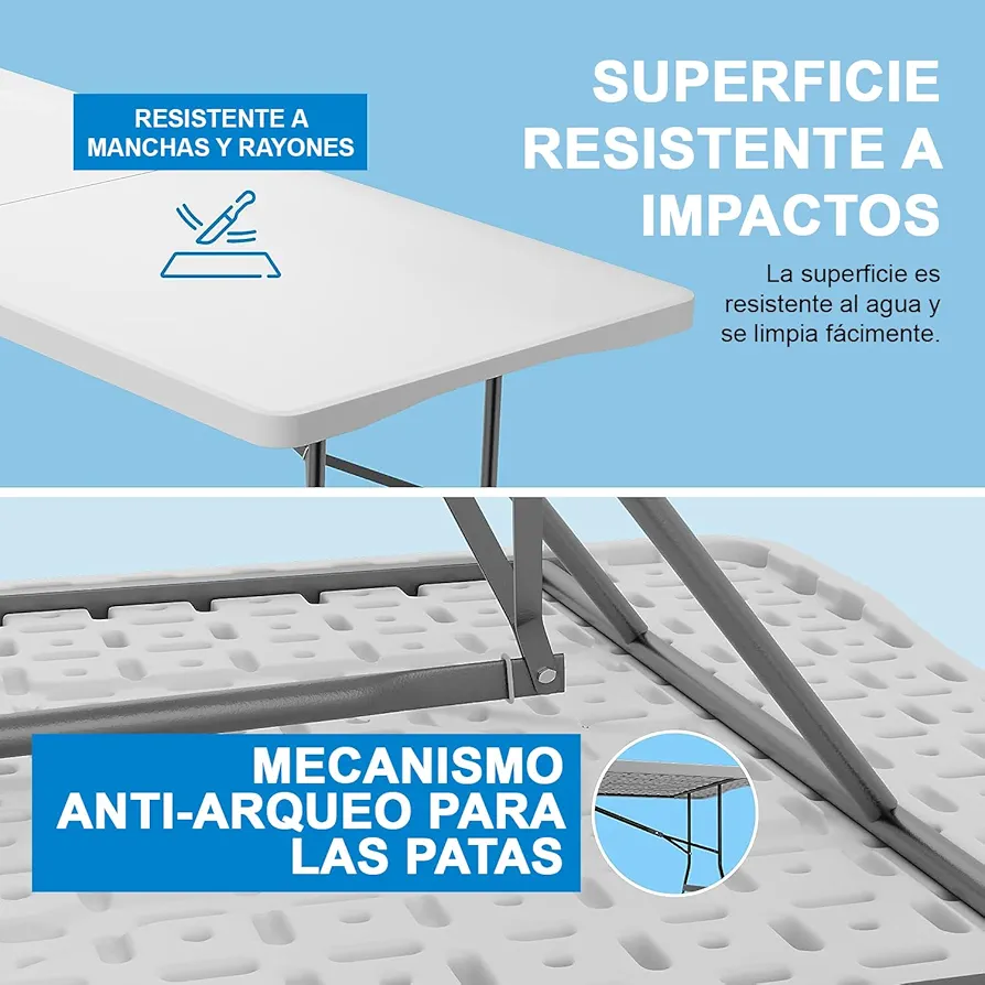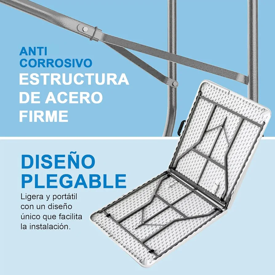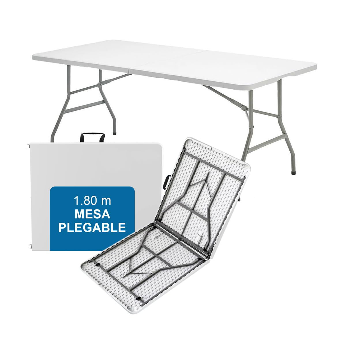 - Mesa PLEGABLE TIPO PORTAFOLIO 1.80m, es perfecta para momento con la familia y amigos. Su diseño practico, cómodo y portátil es ideal para llevarla y traerla a cualquier parte Superficie rígida Fácil de armar, su instalación requiere pocos segundos. Mesa plegable para facilitar su transporte y resguardo.