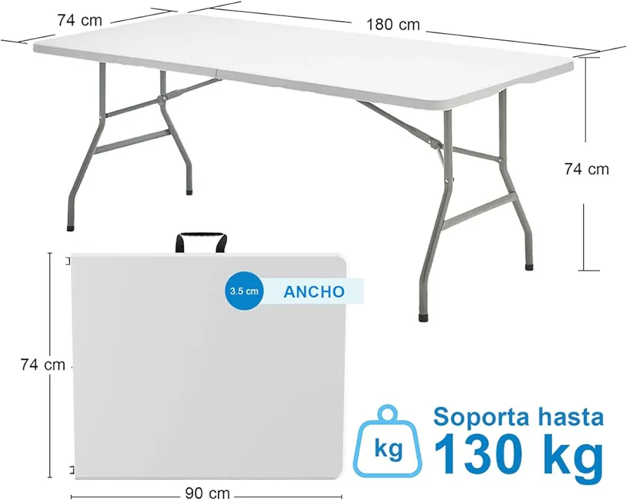 - La mesa está diseñada para ahorrar espacio, con su sistema PLEGABLE puedes llevarla en la cajuela del automóvil o a mano, cuenta con AGARRADERA para facilitar su transporte. MEDIDAS INSTALADA Largo: 180 cm. Alto: 74 cm. Ancho: 74 cm. AGUANTA hasta un máximo de 130 kilogramos