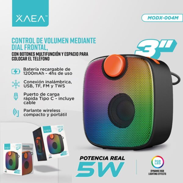 Este parlante pequeño con potencia de 5W ofrece un sonido equilibrado para tus espacios cotidianos. Con conectividad BT, funciones FM, TF, TWS y USB, además de luces LED y batería de 1200mAh que rinde hasta 4 horas. Carga rápida por Tipo C y diseño portátil, ideal para el día a día.
